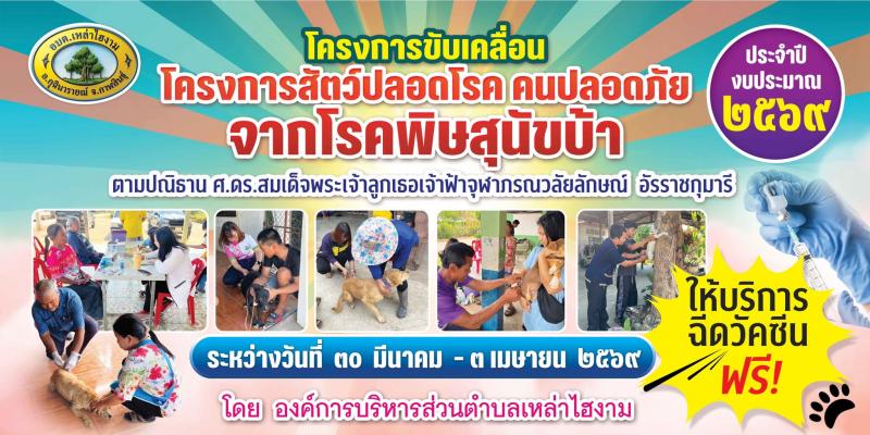 กองสาธารณสุขและสิ่งแวดล้อม องค์การบริหารส่วนตำบลเหล่าไฮงาม ดำเนินการจัดกิจกรรมโครงการสัตว์ปลอดโรค คนปลอดภัยจากพิษสนัขบ้า ตามปณิธาน ศ.ดร.สมเด็จพระเจ้าลูกเธอเจ้าฟ้าจุฬาภรณวลัยลักษณ์ อัรราชกุมารี ประจำปีงบประะมาณ 2569 ตั้งแต่วันที่ 30 มีนาคม - 3 เมษายน 2569