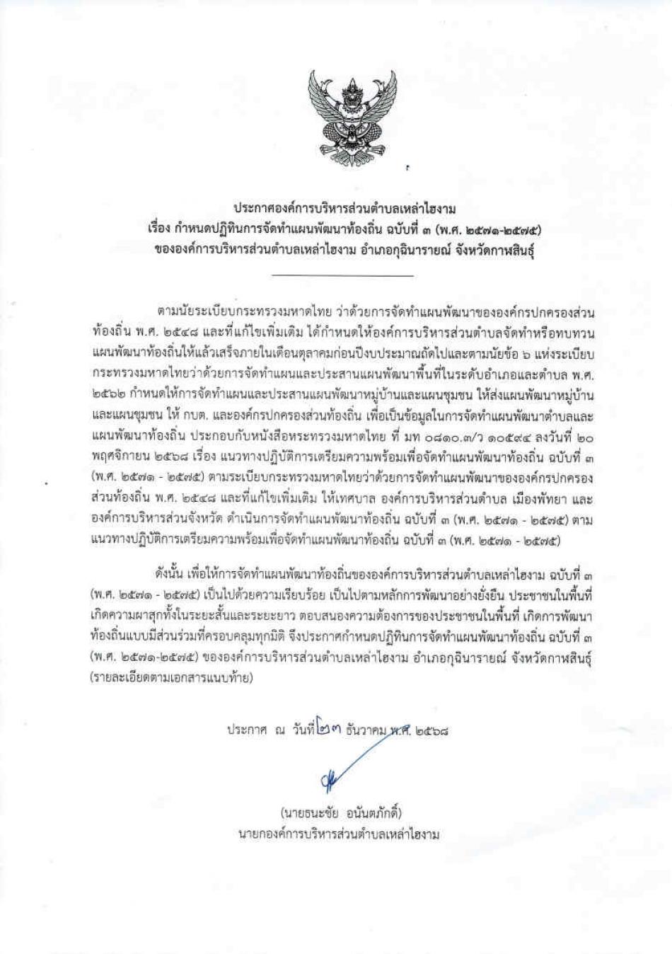 ประกาศองค์การบริหารส่วนตำบลเหล่าไฮงาม เรื่อง ปฏิทินการจัดทำแผนพัฒนาท้องถิ่น ฉบับที่ 3 (พ.ศ. 2571-2575)